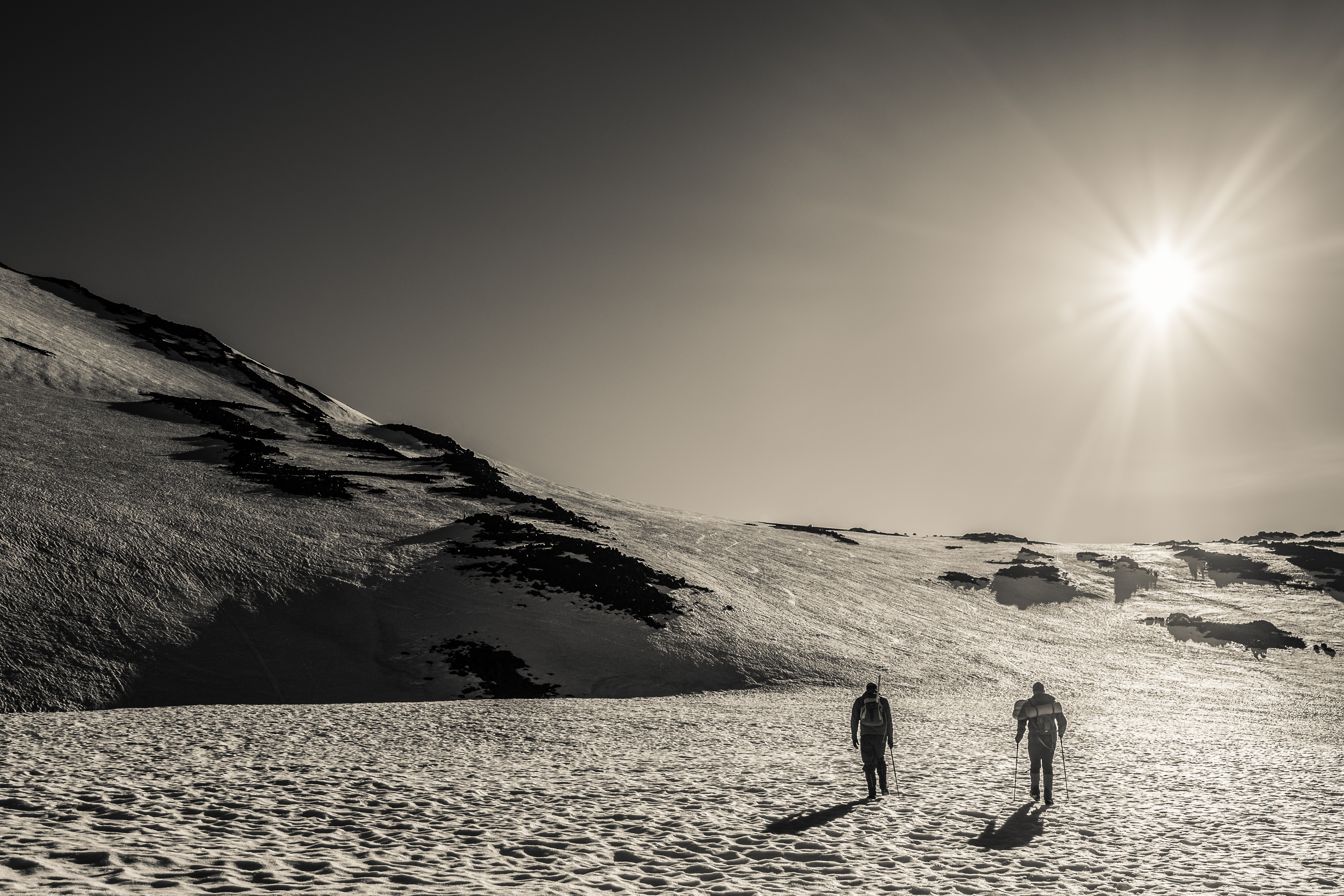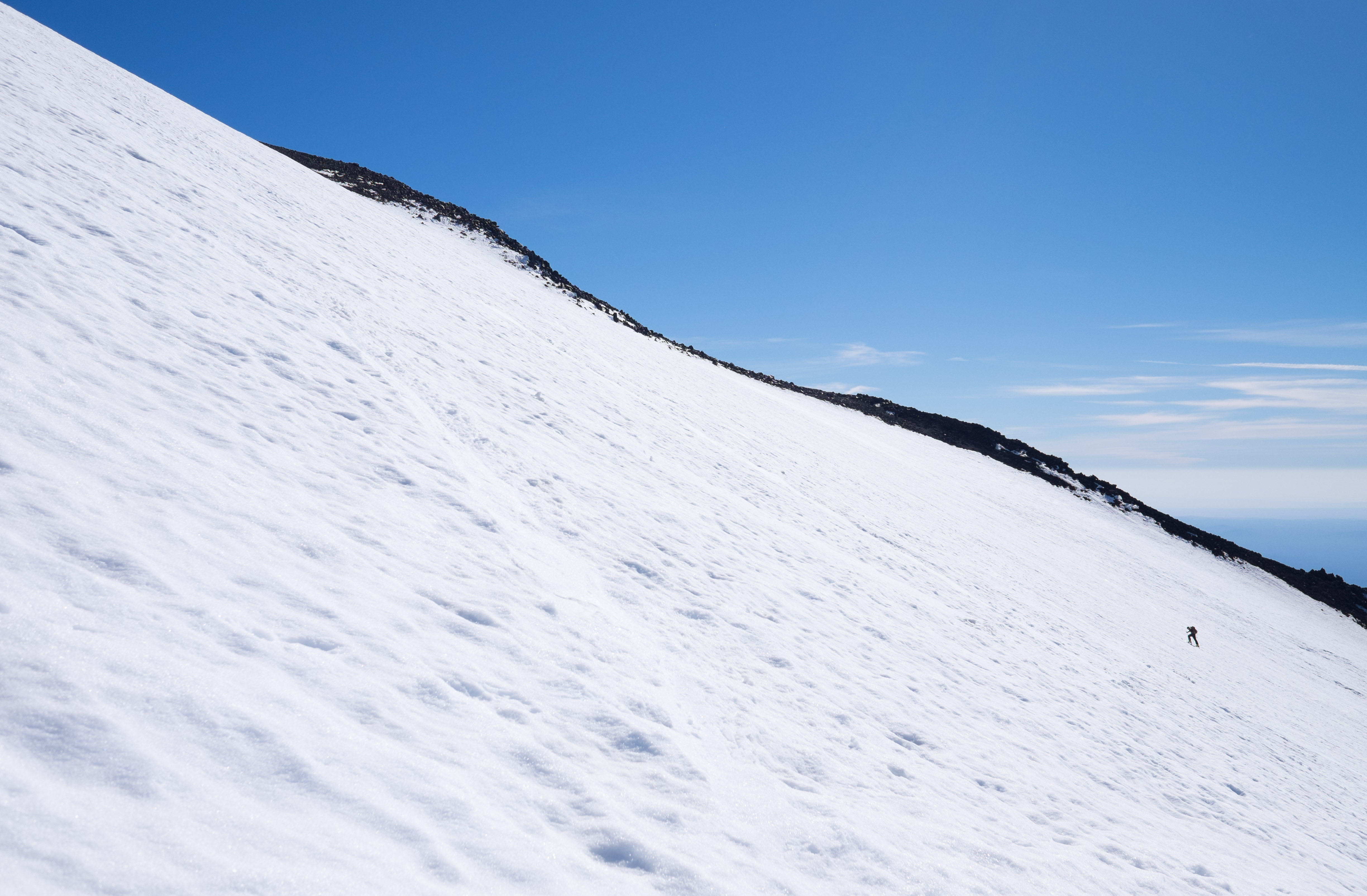 After spending a few minutes on the summit, we began our glissade down the mountain. The others went ahead while I made some holes in my garbage bags to act as a glissade pad, which actually worked out quite well, if you don’t mind looking like you’re wearing a giant diaper! Glissading is a fancy word for sliding down a mountain on your butt. Though my larger pack acted as a brake & prevented me from gaining much speed, it was still an absolute blast & a new experience for me. I’d say it ties in fun factor with the Osunabashiri(Great Sand Run) of Mount Fuji. Maneuvering through the glissade chutes while sliding down the mountain was an absolute blast. It felt kind of like what a bobsled might feel like! I hiked back after the end of the glissade run and after some difficulty, managed to locate the camp.