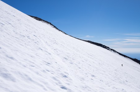 Apparently switchbacks are not in the Adams dictionary. As you can see from the photos, the slope was steep – all the way up to the false summit. However, we were moving at a much slower pace than yesterday, making the ascent manageable, though by no means easy. It was steep enough to glissade down, which meant that falling could mean sliding down & losing ground. My ice axe definitely made me feel more secure here.