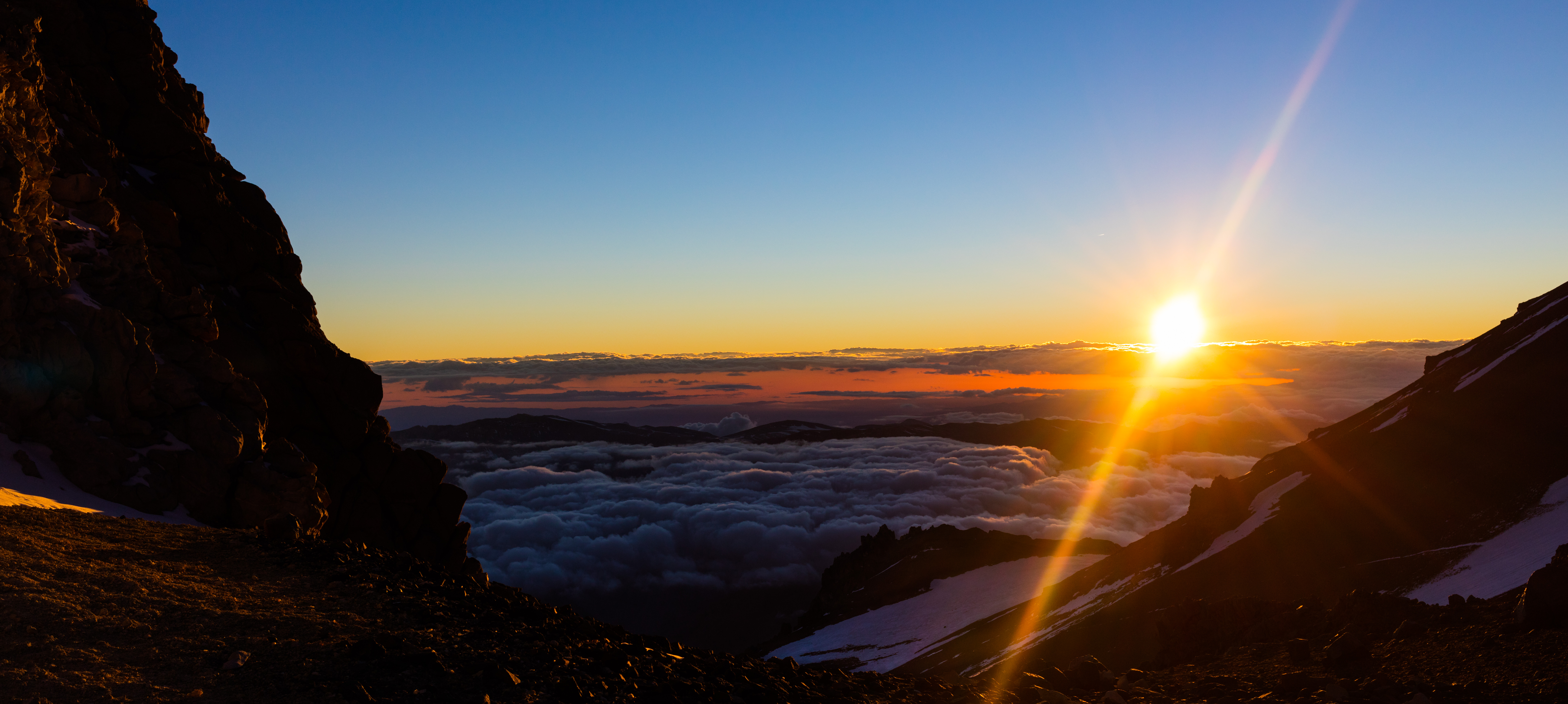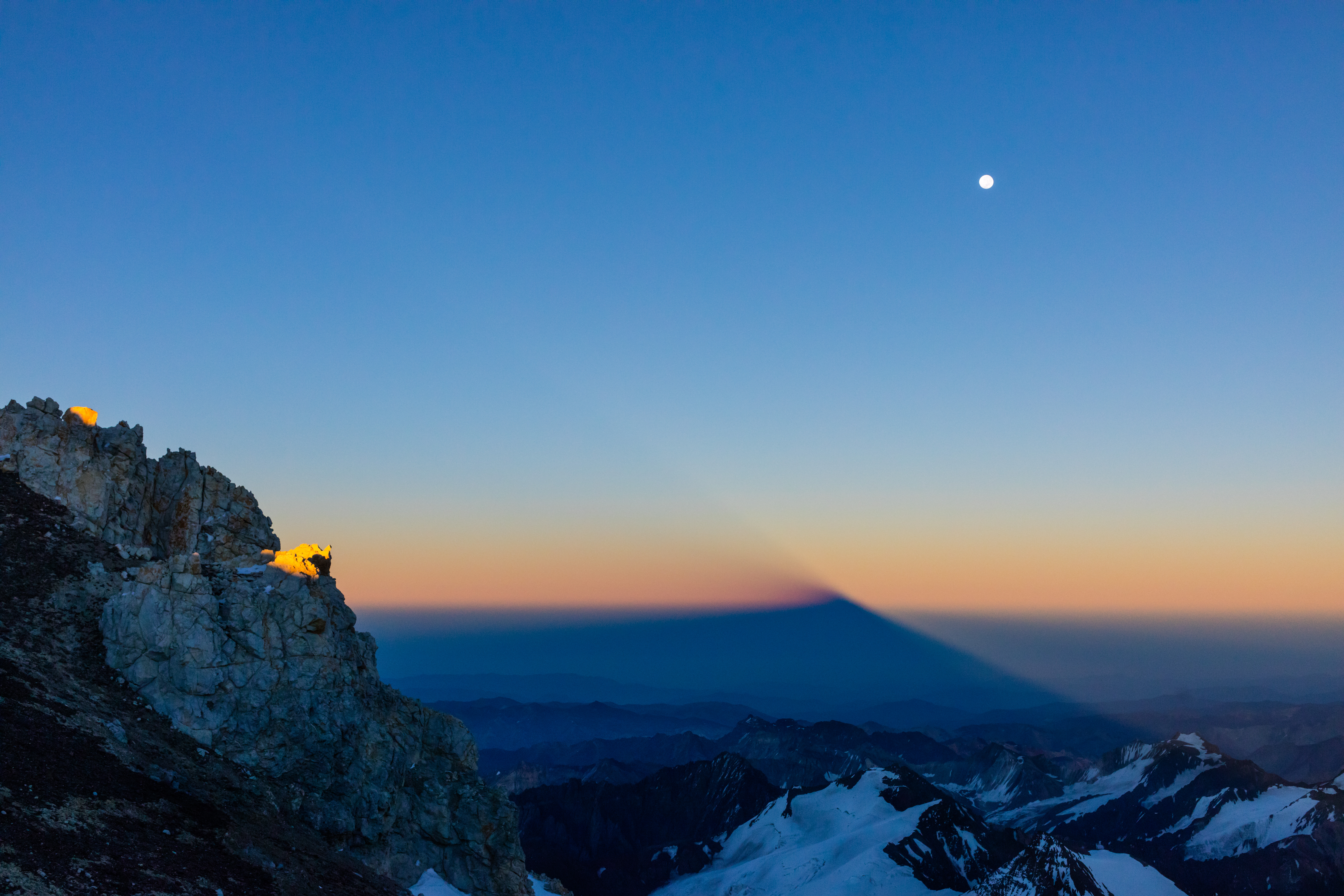 We were woken at around 4 AM, having breakfast and getting our layers on. Huey & I were the last to get ready, though I really didn’t feel like we took that long – clearly I’m not a morning person. It was of course still dark so we had headlamps on as we started out. The first section was decently steep and we moved at a decent clip as well. I began wondering whether I’d be able to maintain this pace for the rest of the climb, but thankfully after about an hour and a half we came to our first break, right as dawn broke giving us a view of a phenomena I still can’t quite explain. We saw the shadow of this gigantic mountain break the horizon, yet we could see rays of light break the horizon at the same angle as the mountain’s shadow. It’s a really cool effect that occurs on huge mountains like these when the sun is low.