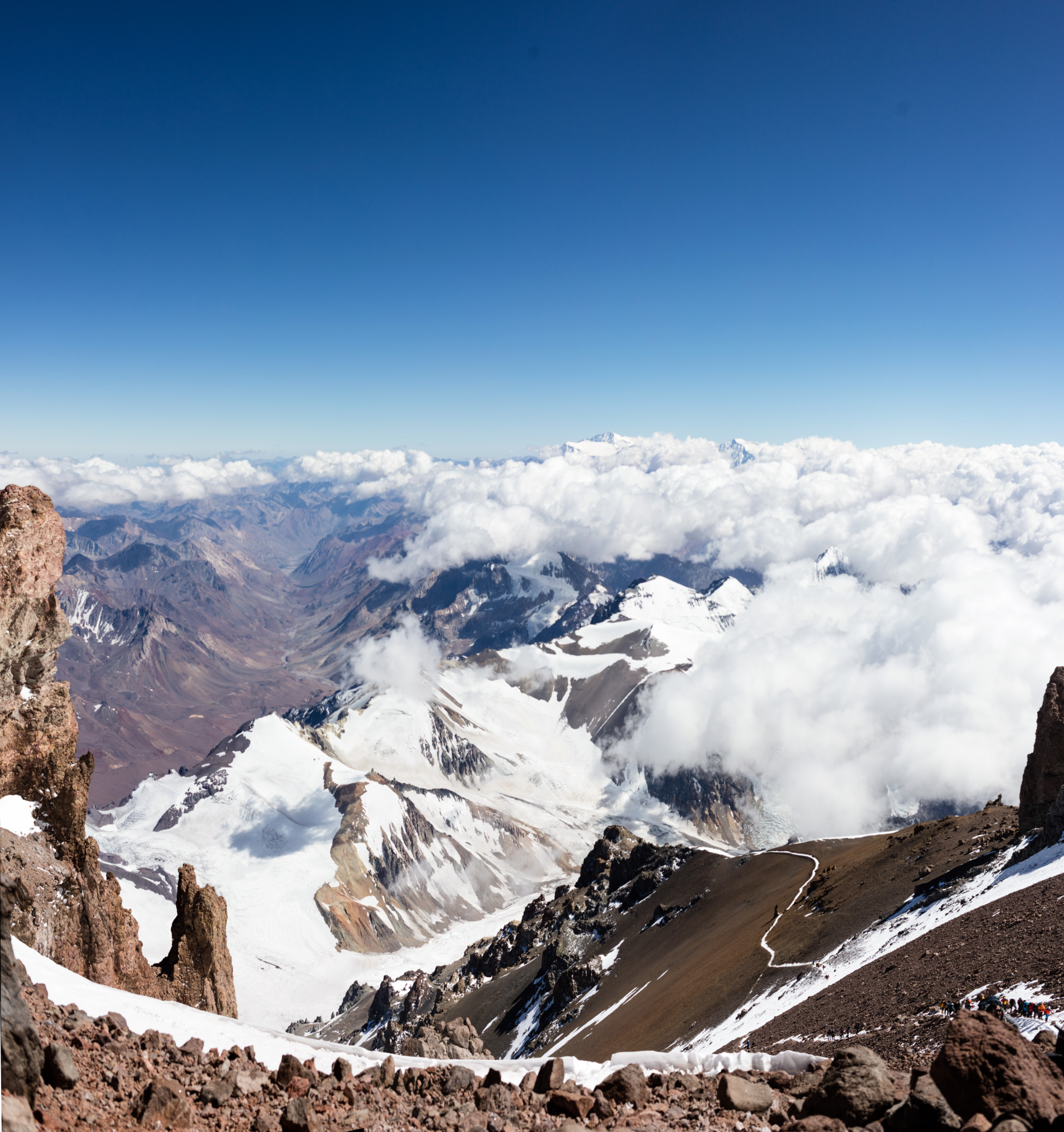 We hung out here for about 40 minutes, waiting for our other team mates to catch up as some had fallen behind, while shoveling as much food and water into our systems. Appetite is non-existent at this altitude so eating was a chore, even though I was eating delicious chocolate bars. The views however, were incredibly breathtaking. To be able to see two miles or more down into the valleys far far below is really out of this world. It’s an indescribable feeling being so high above everything, and knowing that you got there on your own power.