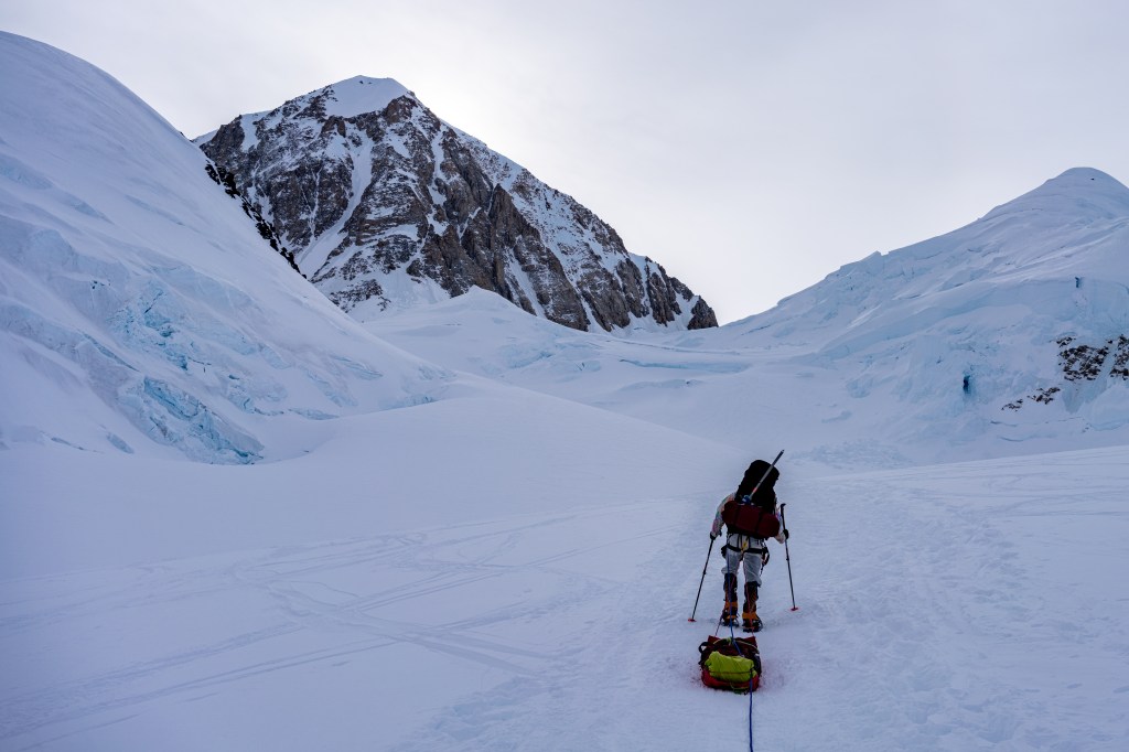 The trip from Camp 1.5 was slightly longer today at around three hours, with a bit more elevation gain. We started a bit later than the previous days, as there wasn’t as much crevasse hazard as we moved up to the beginning of the Upper Kahiltna Glacier. The weather today was chilly owing to the cloud layer that had moved in, but without wind. Wind is really the killer on a mountain like this. It turns a cold – but endurable – climb into one that’s both dangerous and hellish. Clouds aren’t a good sign though. We’re probably in for some bad weather in the coming days. Good weather never lasts long on a mountain like Denali…