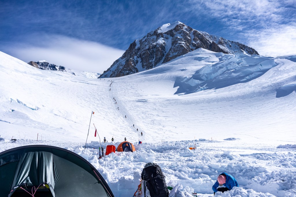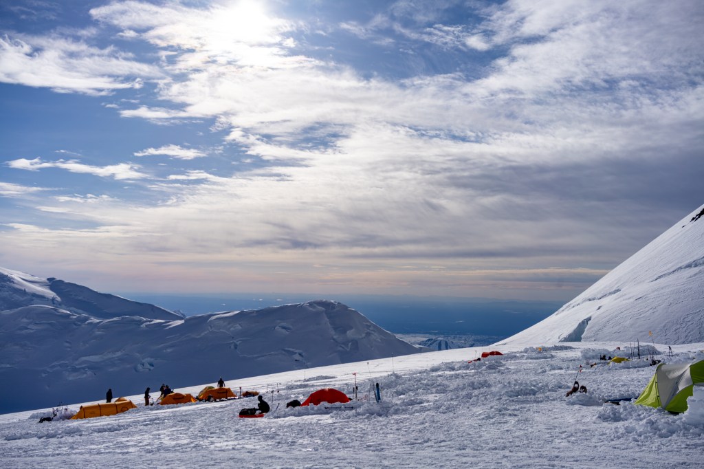 Colby doesn’t really like Eleven Camp, as it’s positioned directly under some gnarly-looking overhangs. Avalanche and rockfall danger is high, here, and we were forced to pick a campsite closer to the danger due to how packed the camp was. This is by far the biggest camp we’ve seen thus far. This camp felt like a base camp, but Colby says this is nothing compared to Fourteen Camp, where the National Park Service has its headquarters on the mountain. Even so, we saw many groups of climbers from all over the world. France and the UK especially had large numbers. Right next to our camp was a group of perhaps thirty British military guys (Royal Guard) who were climbing the mountain as training. It seems one of them even fell through a crevasse doing a carry up to Camp Fourteen. He was alright, but yikes!